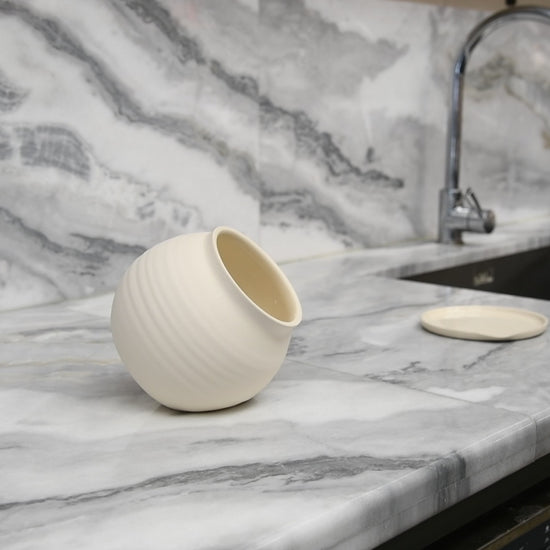 Finished in a soft, creamy colour with a tactile, unglazed exterior and smooth glazed interior. Larger than a traditional salt cellar, it comfortably holds a full box of Maldon salt. Its gentle pivot base makes it effortless to reach into while cooking - a small but thoughtful detail designed for everyday ease.
